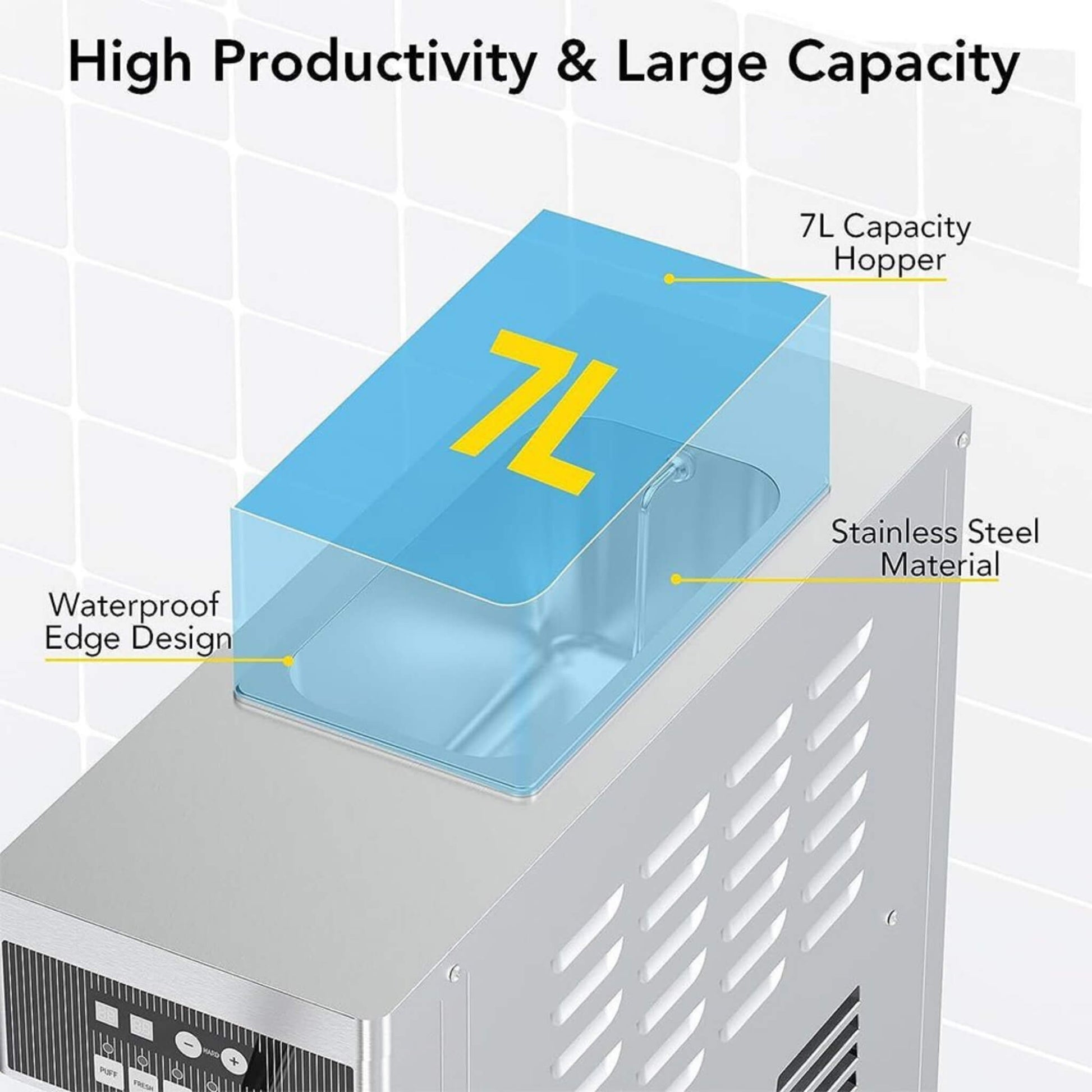 - Designed with 7-liter hopper, made of food-grade 304 stainless steel, this commercial ice cream maker can produce up to 5.3gallon of ice cream per hour for business needs.